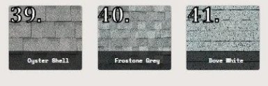 For hotter climate areas, choose a lighter roof color such as Dove White, Frostone Grey, or Oyster Shell (see image below #41-39 respectively) Lighter colors reflect more sunlight and absorb less heat, which can help keep your home cooler and improve energy efficiency.