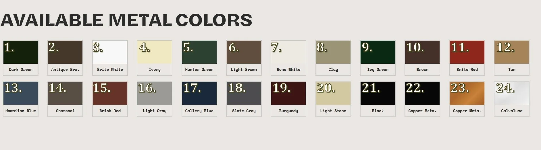 For colder climates, it’s the opposite. Darker colors like #1 Matte Black, #6 Charcoal Grey, or #13 Driftwood in the image below absorb more heat from the sun, which can help with snow melt and provide a slight boost in warmth during colder months.